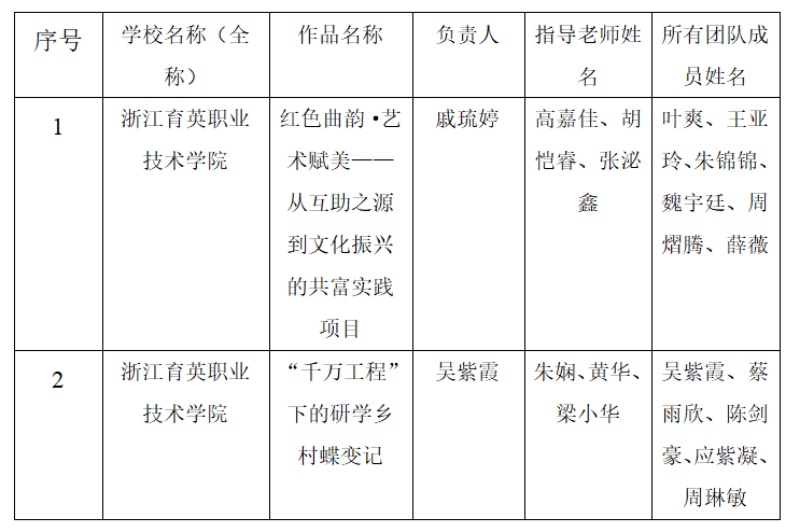 經(jīng)個(gè)人申報(bào)、各學(xué)院推薦、專家評(píng)審,根據(jù)省賽相關(guān)要求,擬推薦《紅色曲韻·藝術(shù)賦美——從互助之源到文化振興的共富實(shí)踐項(xiàng)目》等2項(xiàng)作品代表浙江育英職業(yè)技術(shù)學(xué)院參加浙江省第十九屆“挑戰(zhàn)杯”大學(xué)生課外學(xué)術(shù)科技作品競(jìng)賽紅色專項(xiàng)賽項(xiàng)目。現(xiàn)予以公示: