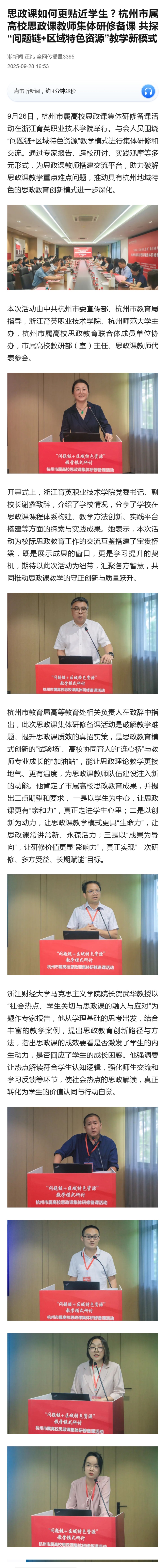 9月26日,杭州市屬高校思政課集體研修備課活動(dòng)在浙江育英職業(yè)技術(shù)學(xué)院舉行。與會(huì)人員圍繞“問(wèn)題鏈+區(qū)域特色資源”教學(xué)模式進(jìn)行集體研修和交流。通過(guò)專家報(bào)告、跨校研討、實(shí)踐觀摩等多元形式,為思政課教師搭建交流平臺(tái),助力破解思政課教學(xué)重點(diǎn)難點(diǎn)問(wèn)題,推動(dòng)具有杭州地域特色的思政教育創(chuàng)新模式進(jìn)一步深化。